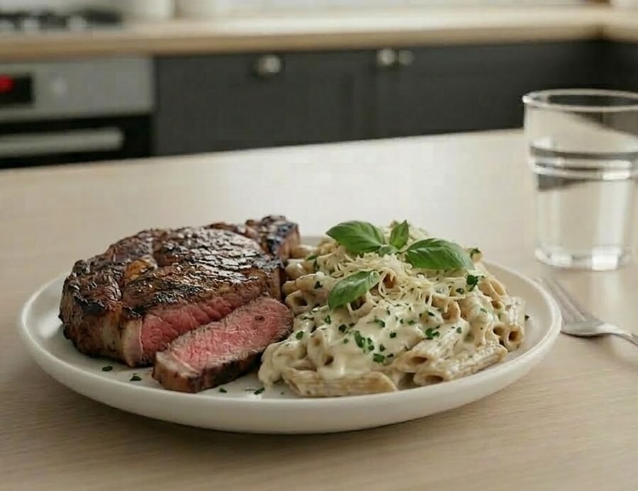 BIFE DE ENTRECOT CON PASTA INTEGRAL A LA CREMA