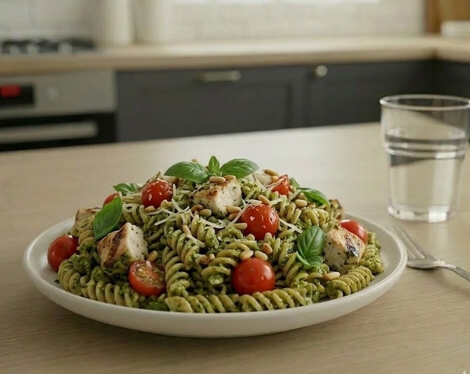 ENSALADA DE PESTO CON PASTA INTEGRAL, POLLO Y TOMATES CHERRY